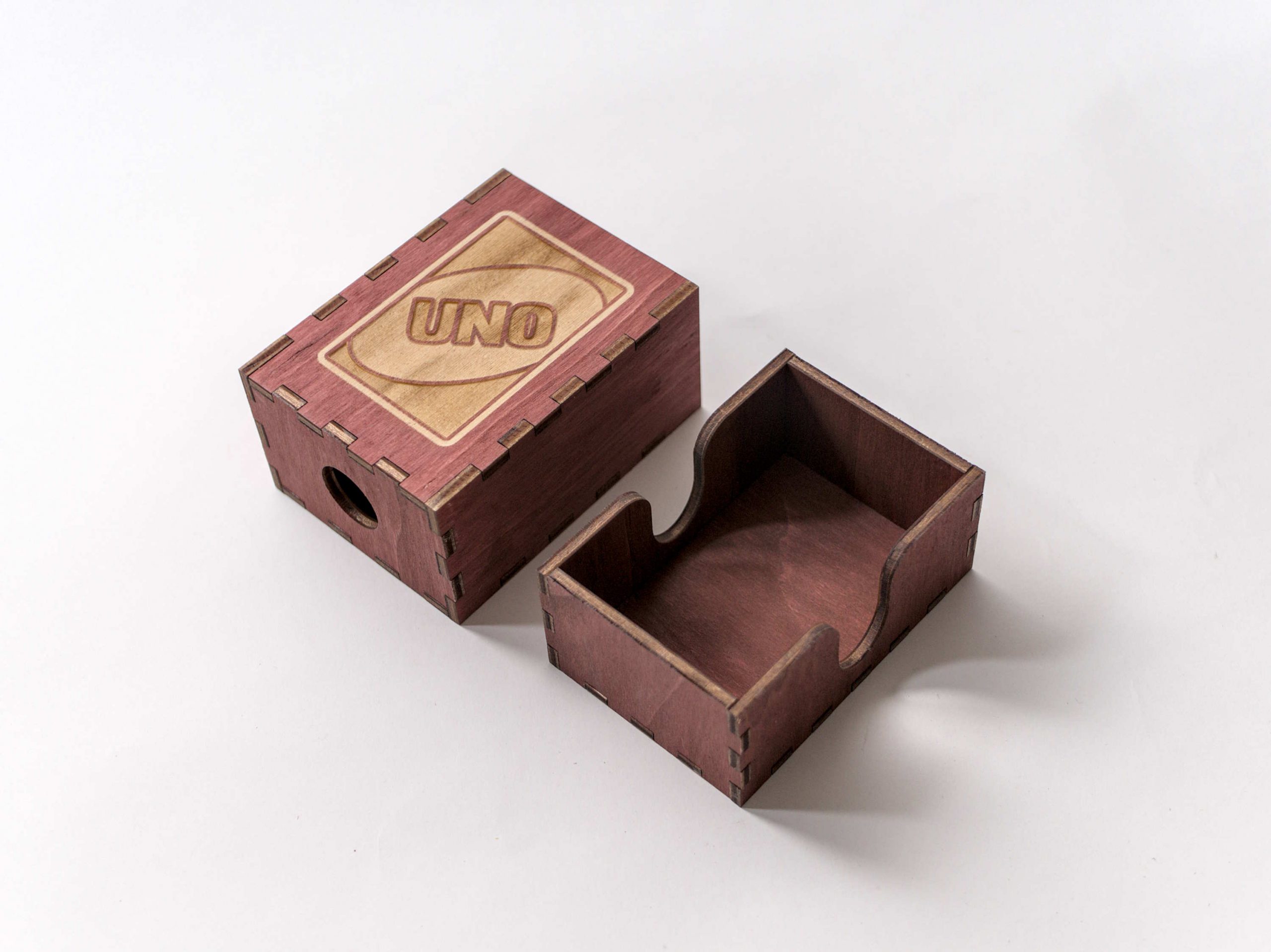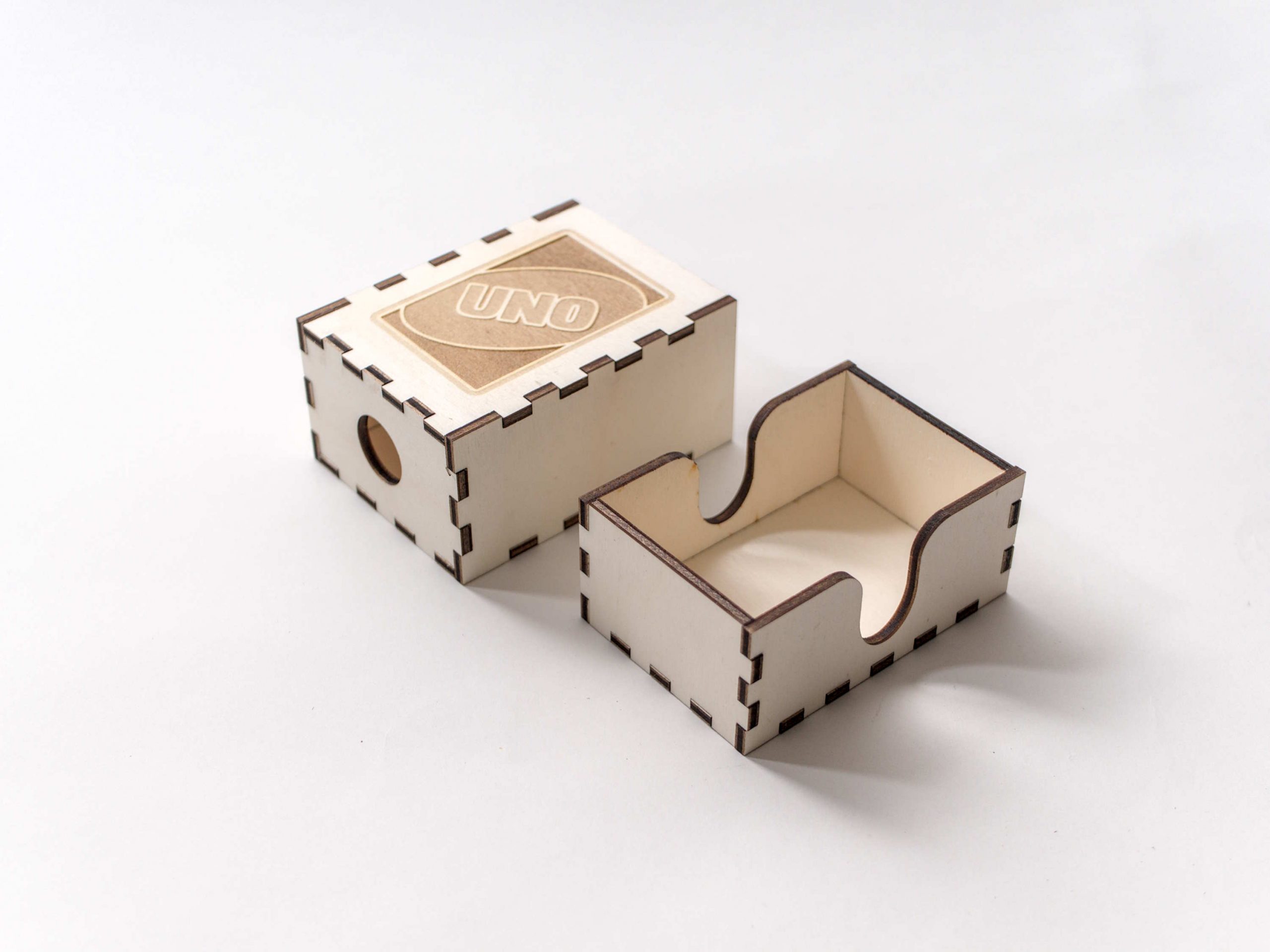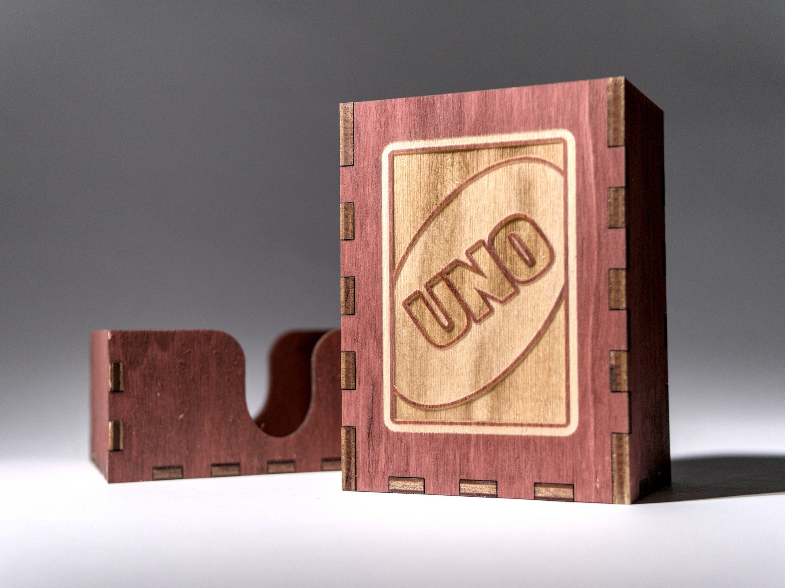 Mit dieser hochwertigen Holzbox bewahrst du deine Karten stilvoll und sicher auf. Das kunstvoll eingravierte Design, inspiriert von klassischen Kartenspielen, verleiht der Box eine edle Optik und macht sie zum perfekten Accessoire für jeden Spieleabend.