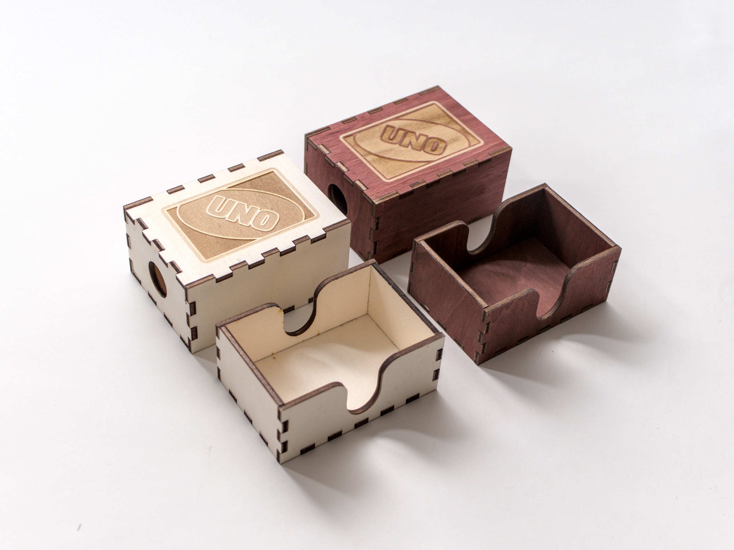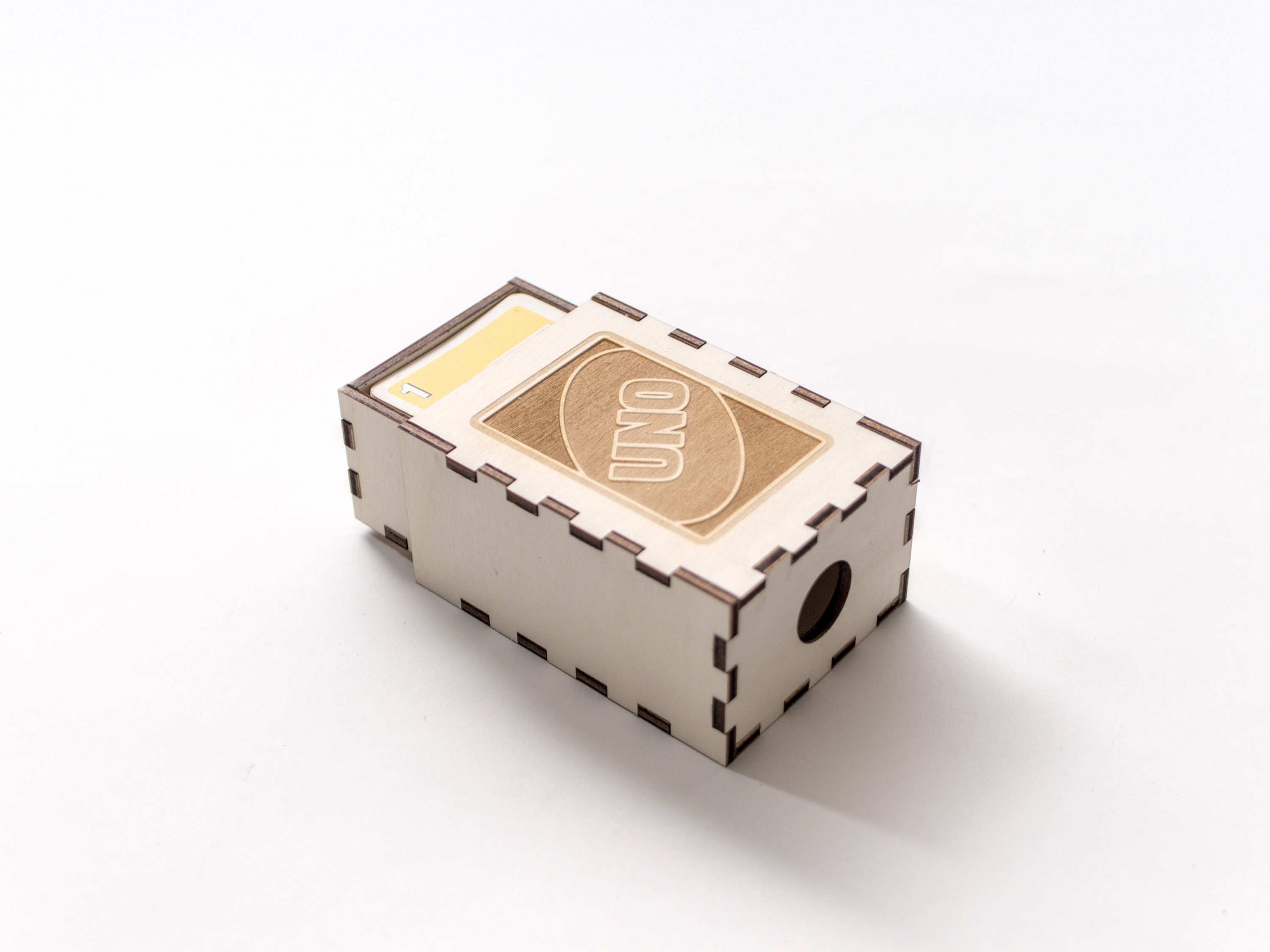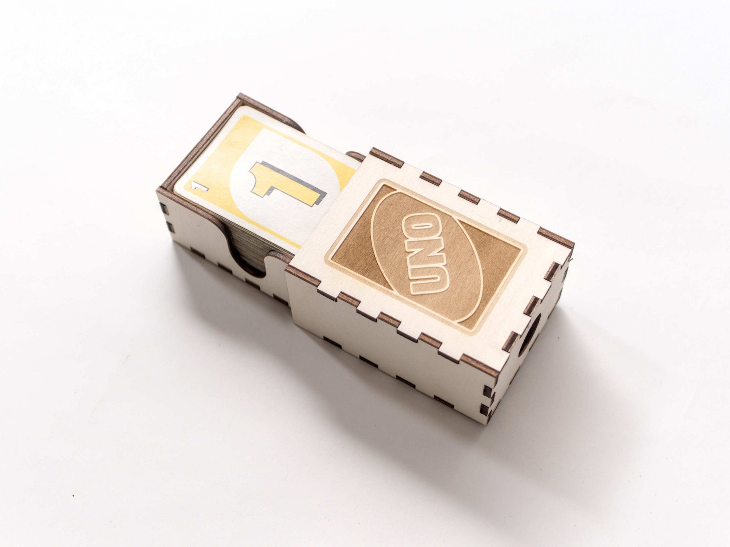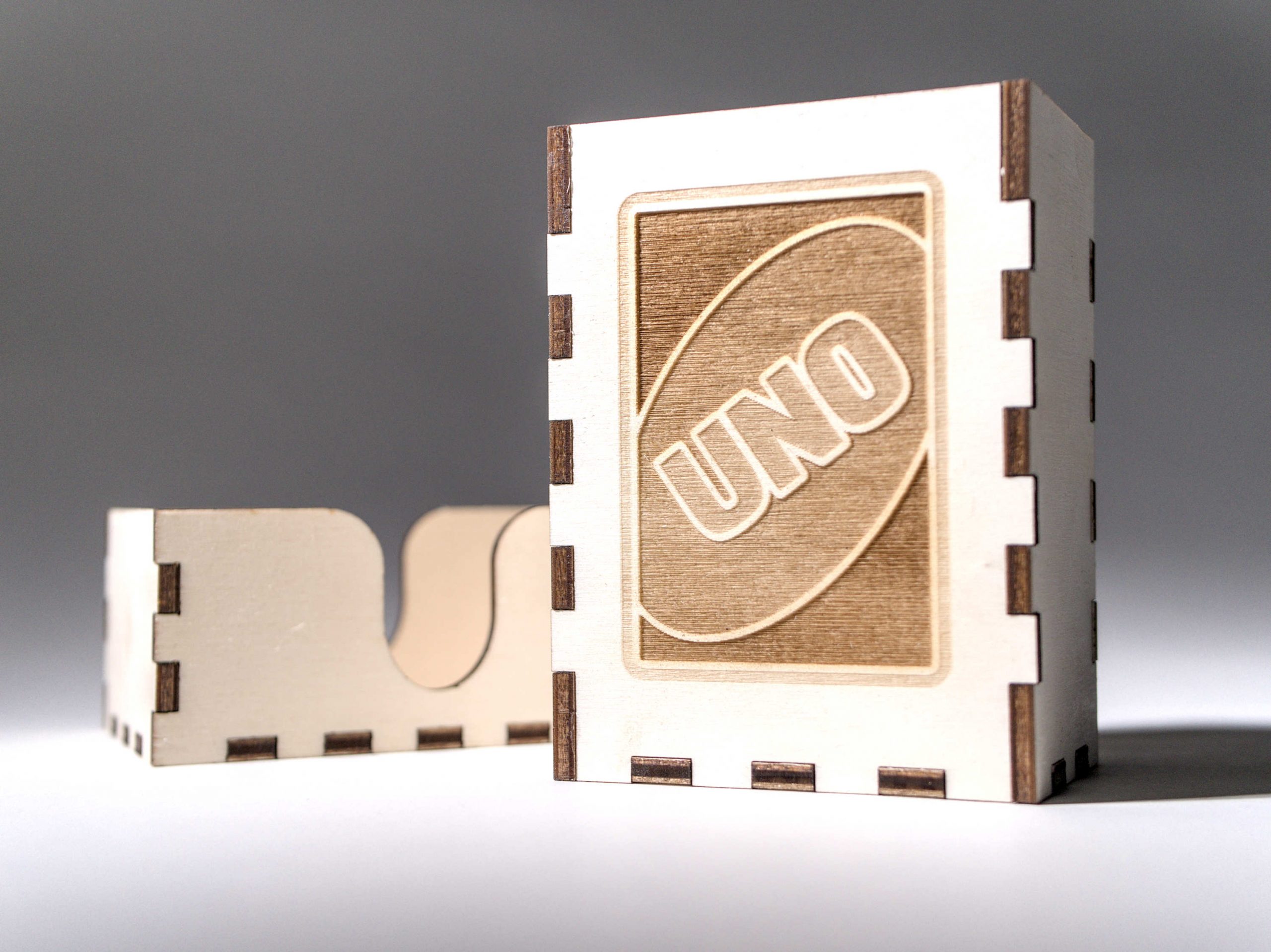 Mit dieser hochwertigen Holzbox bewahrst du deine Karten stilvoll und sicher auf. Das kunstvoll eingravierte Design, inspiriert von klassischen Kartenspielen, verleiht der Box eine edle Optik und macht sie zum perfekten Accessoire für jeden Spieleabend.